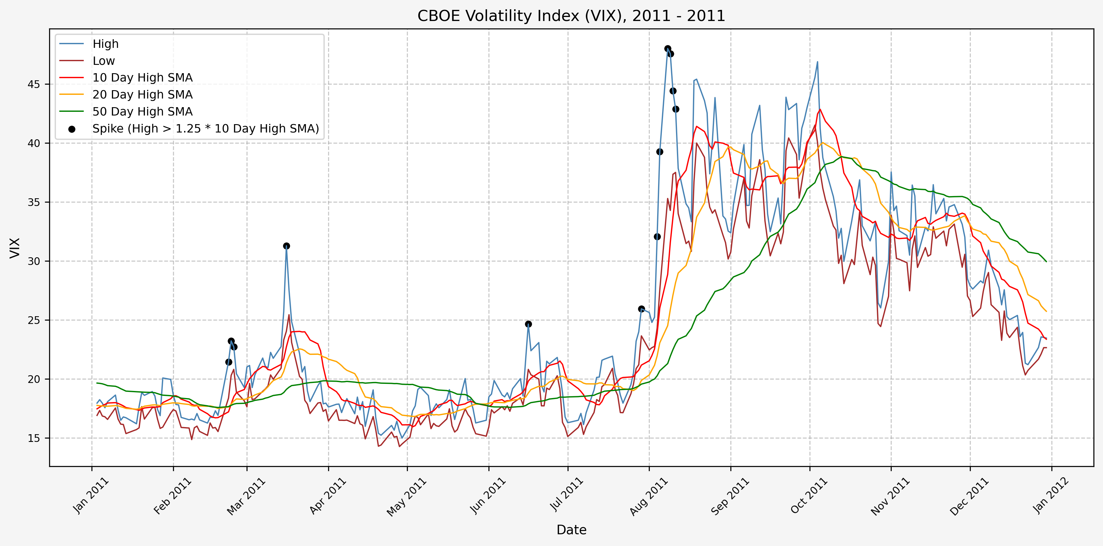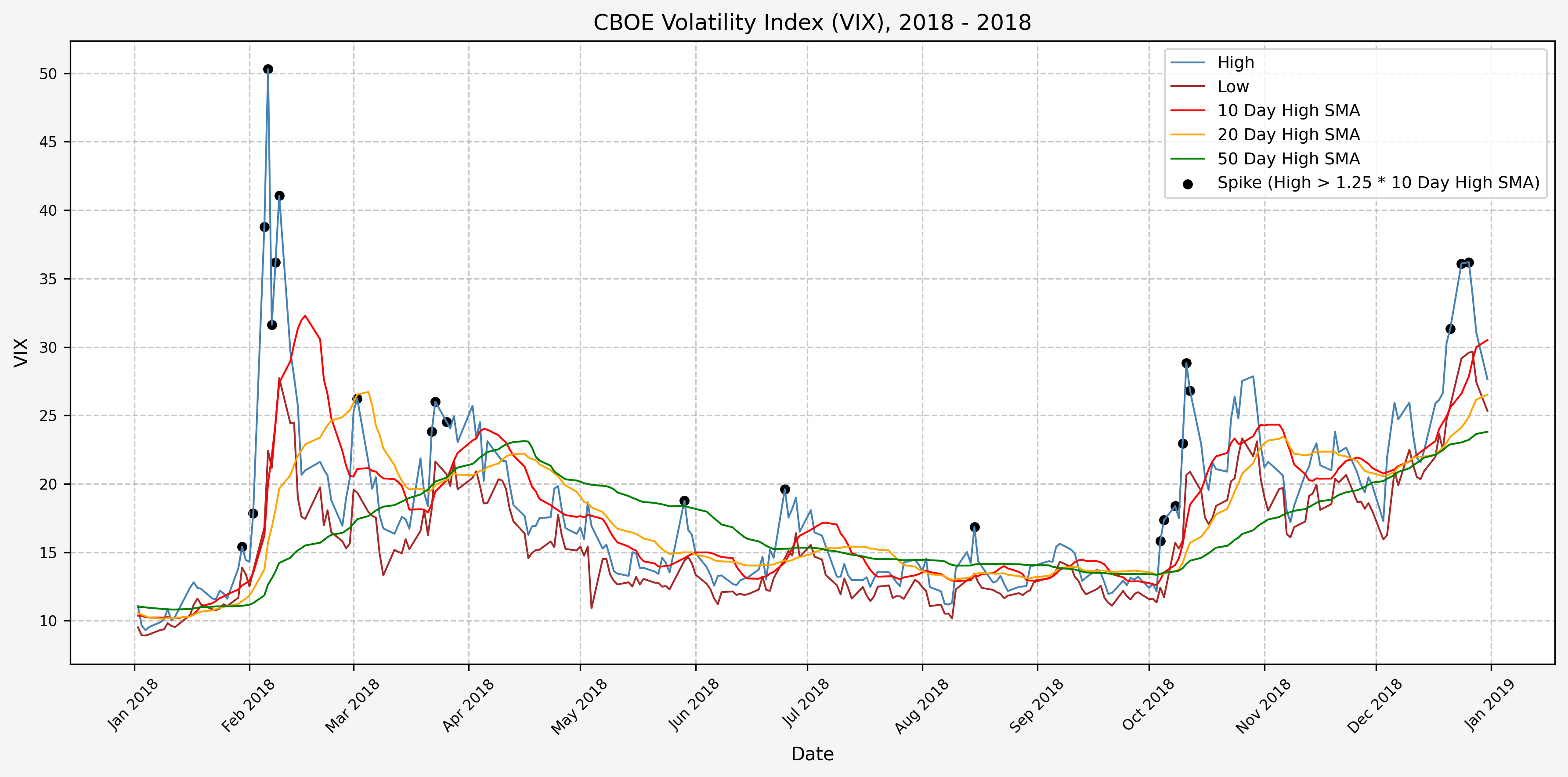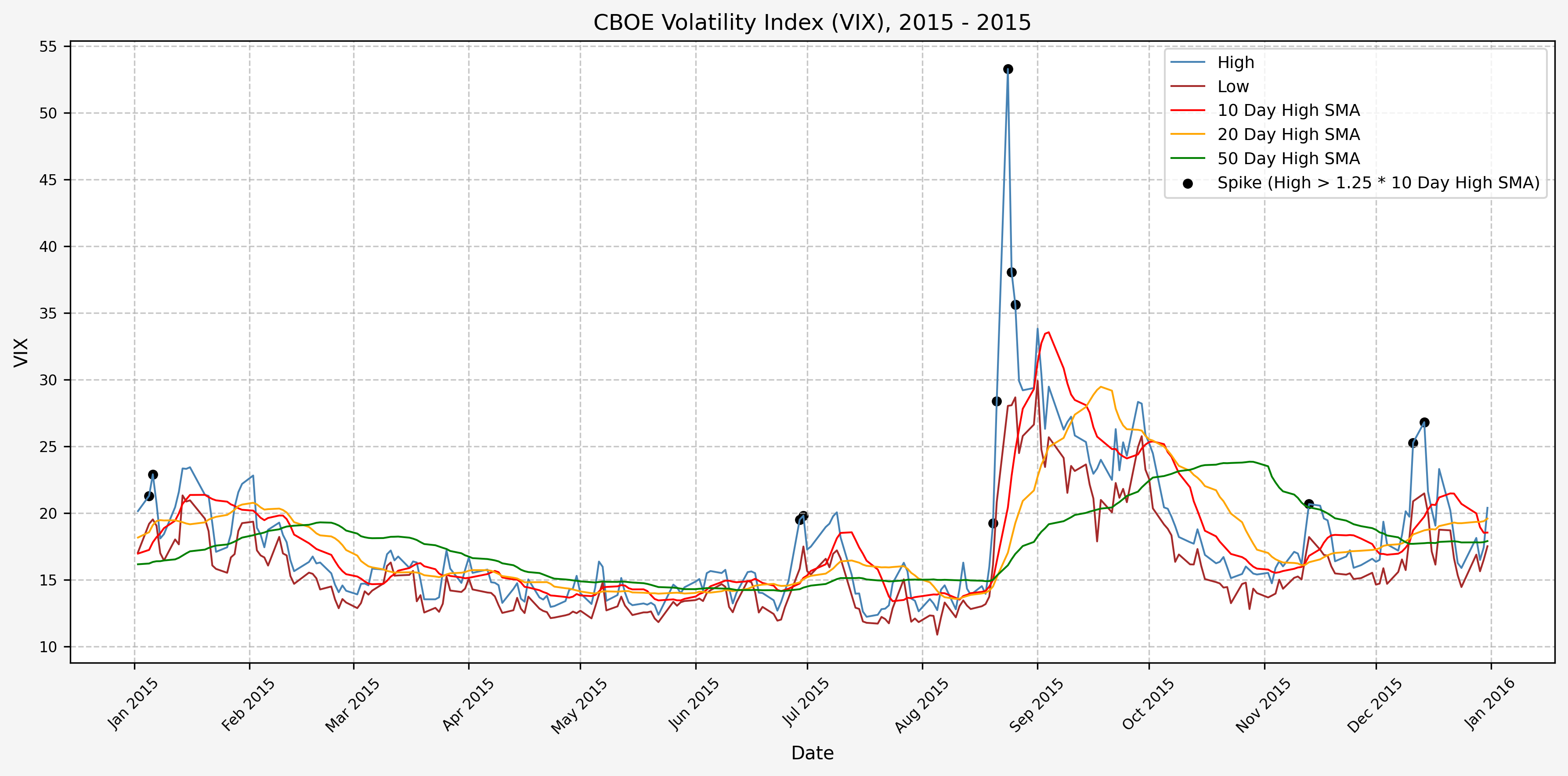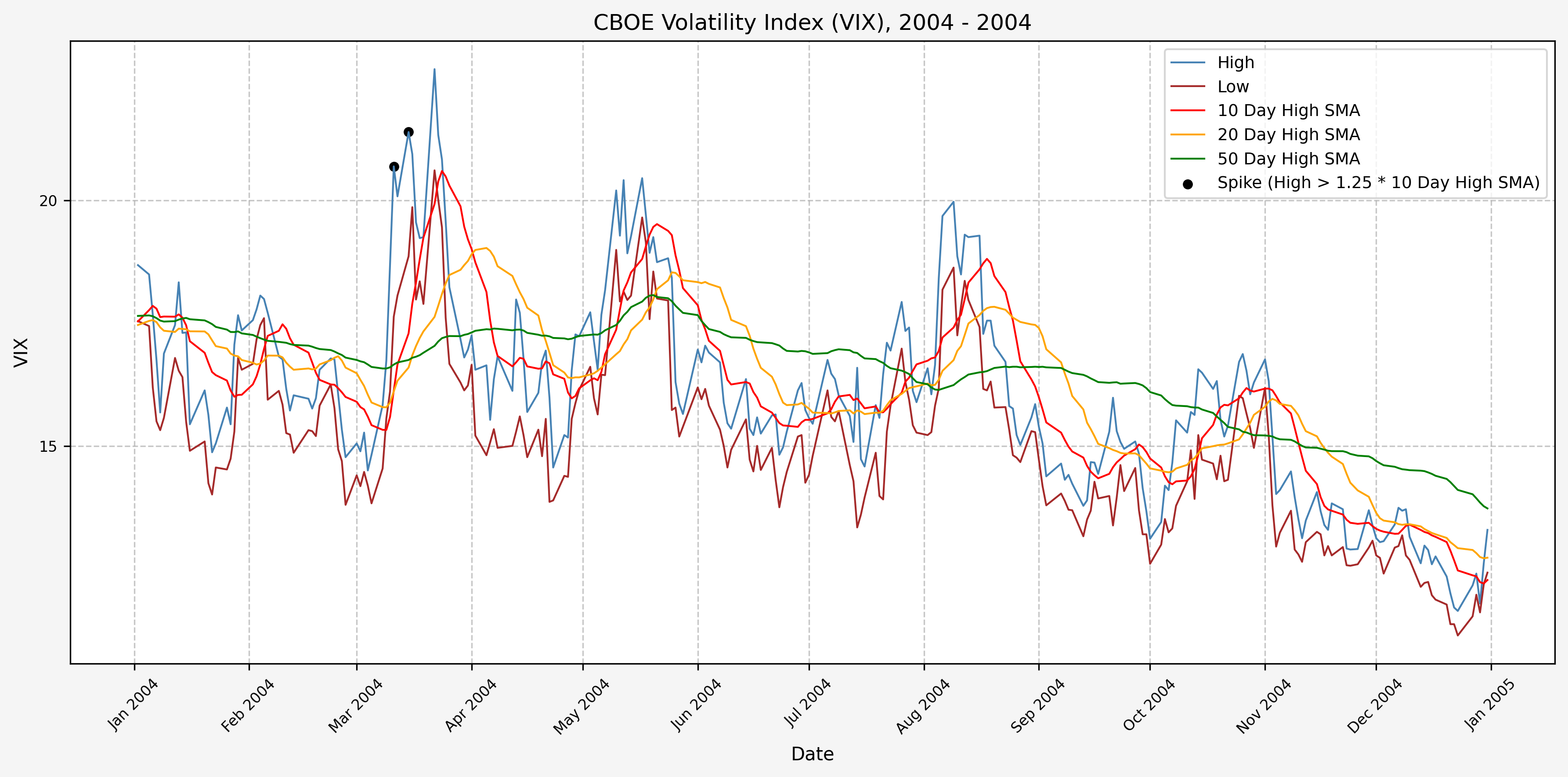We also will generate the 20 and 50 day SMAs for reference, and again to see what is happening with the level of the VIX over slightly longer timeframes.