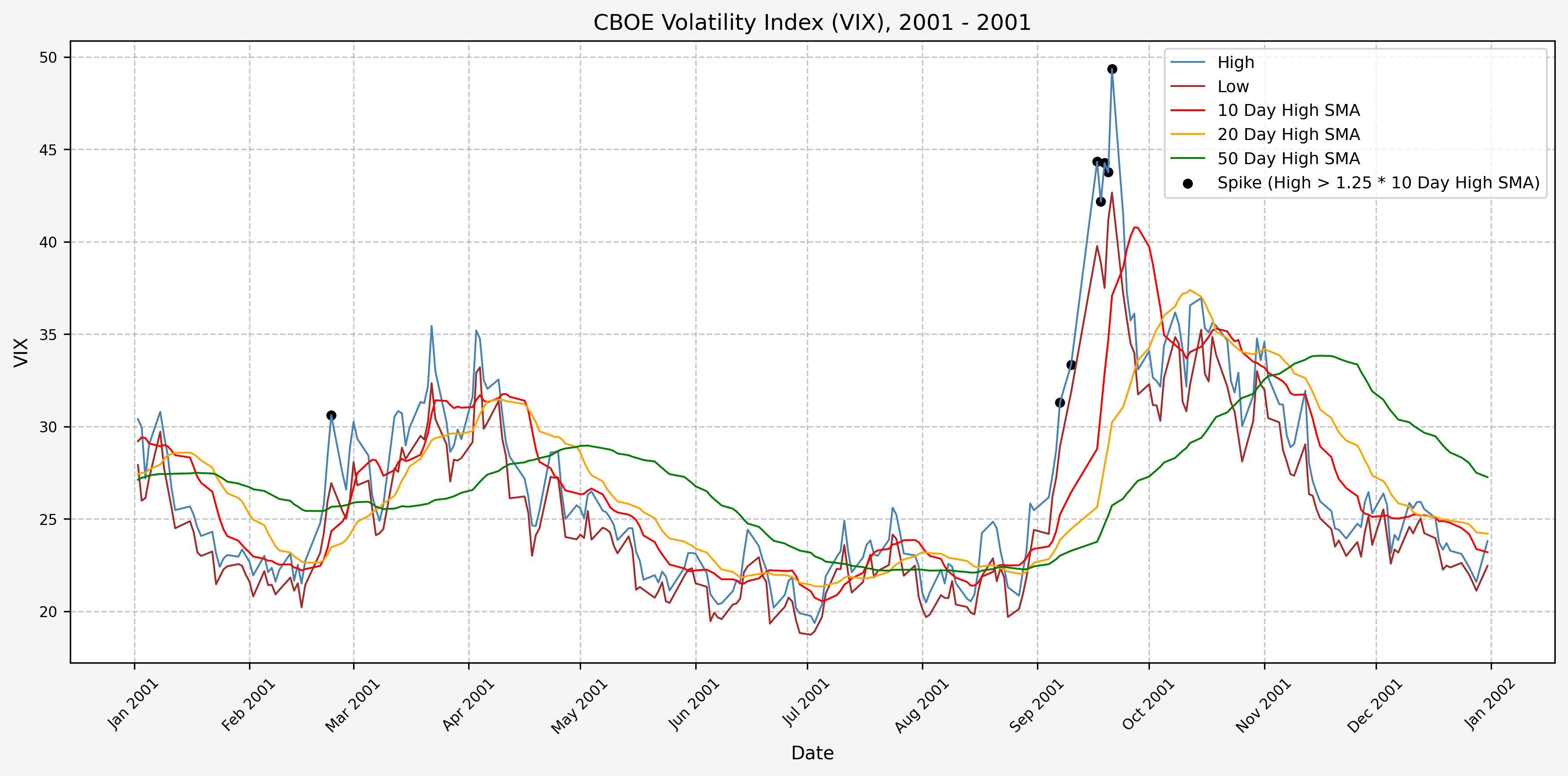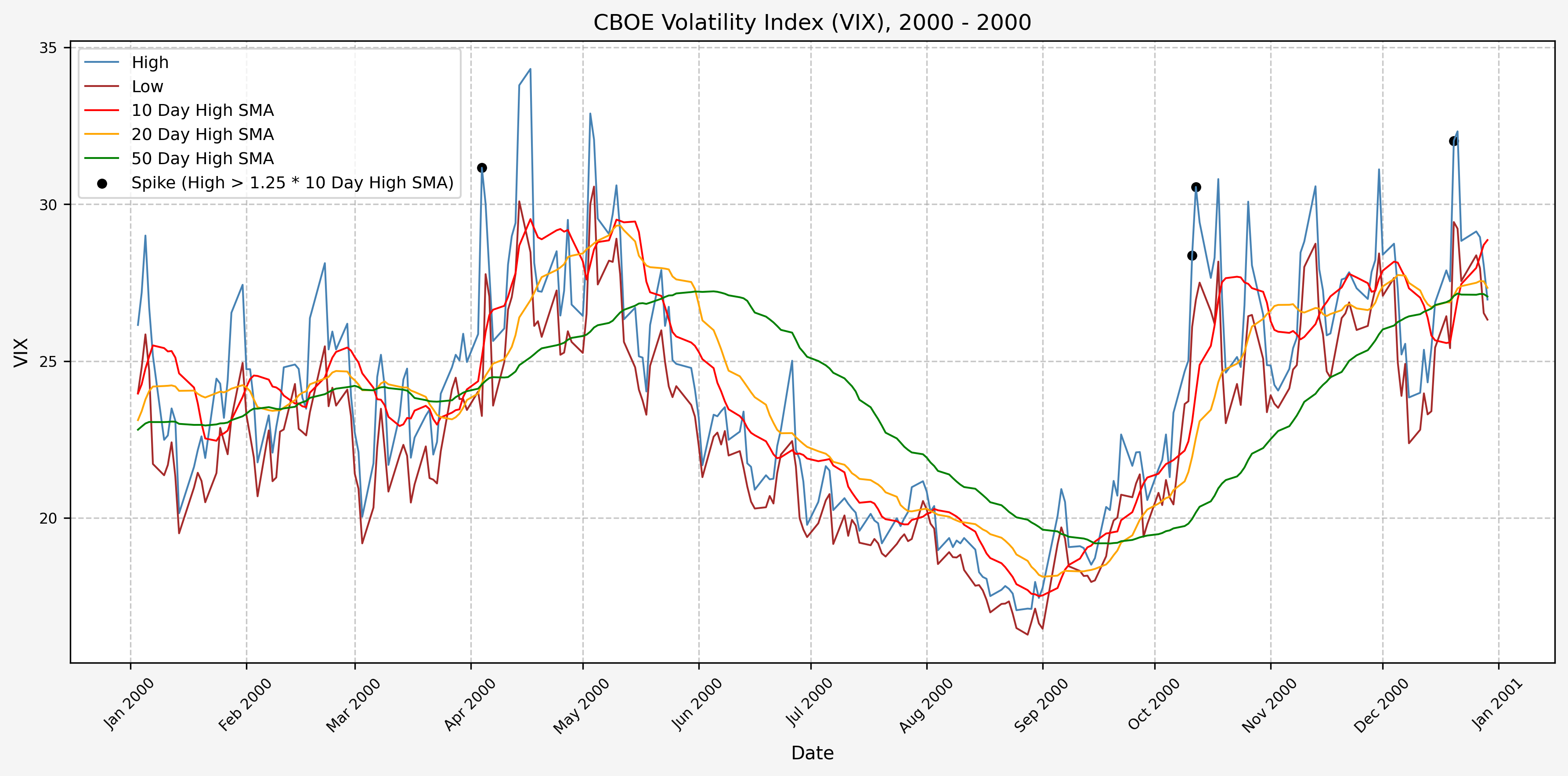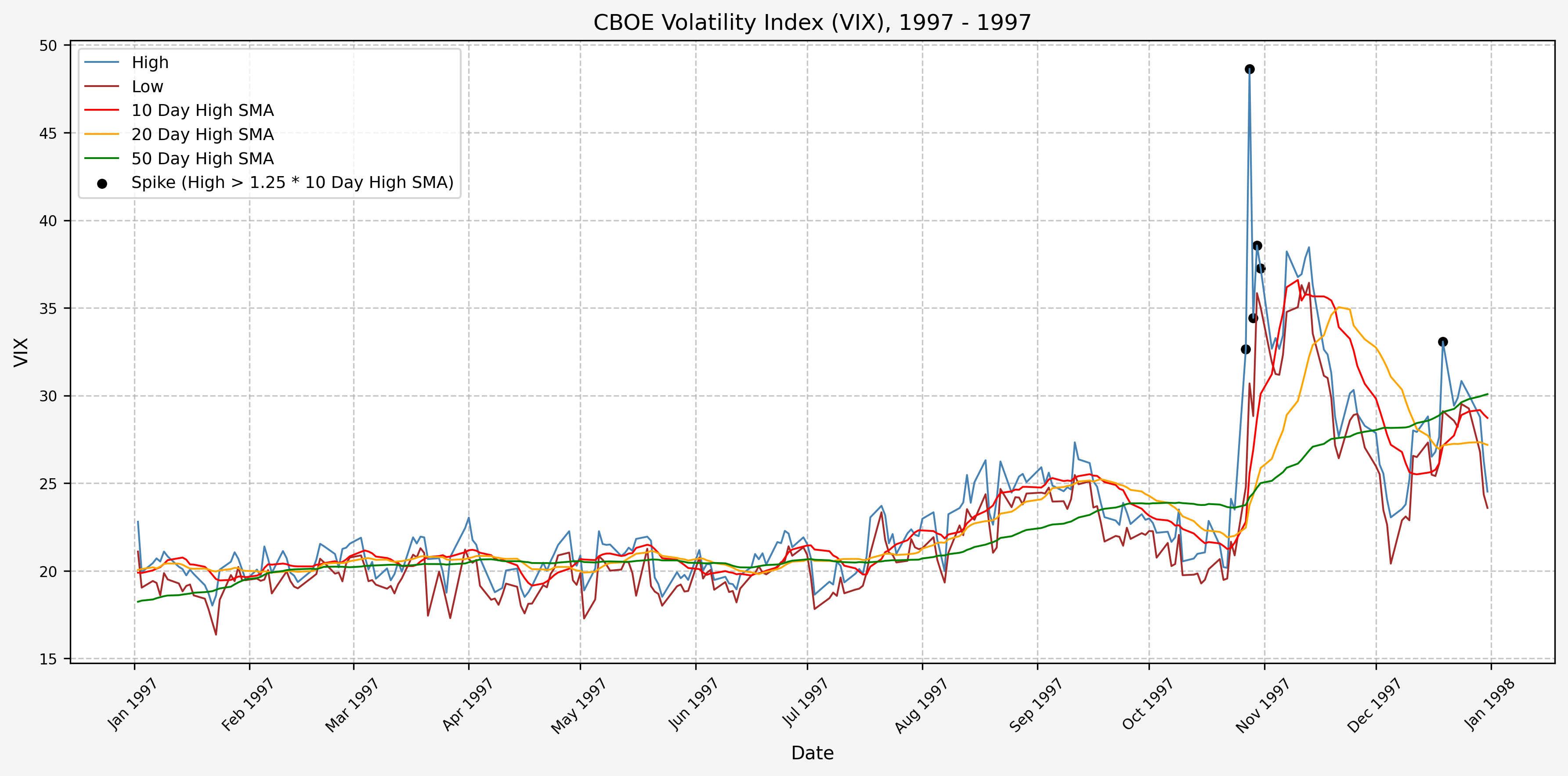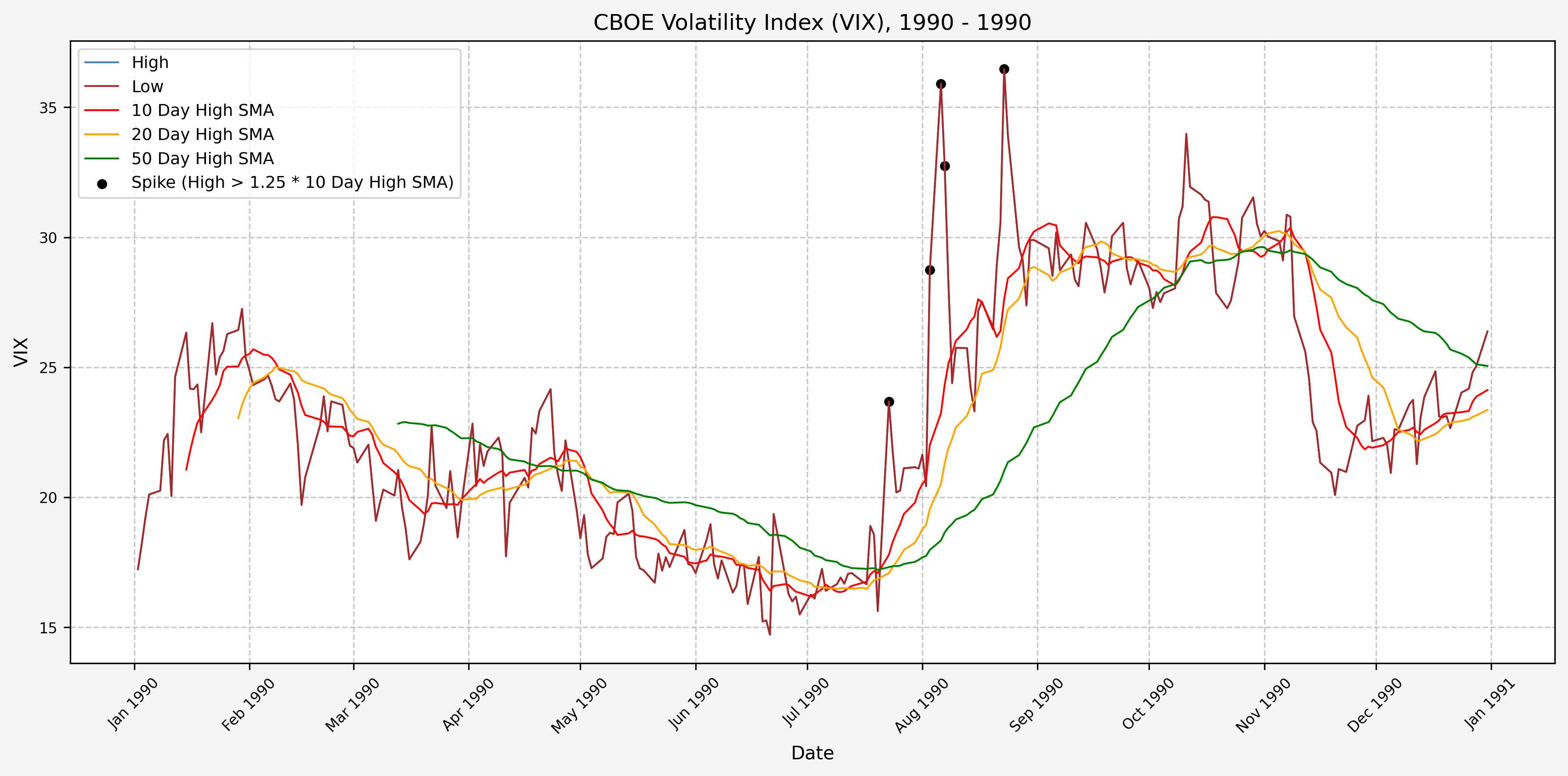 We also will generate the 20 and 50 day SMAs for reference, and again to see what is happening with the level of the VIX over slightly longer timeframes.