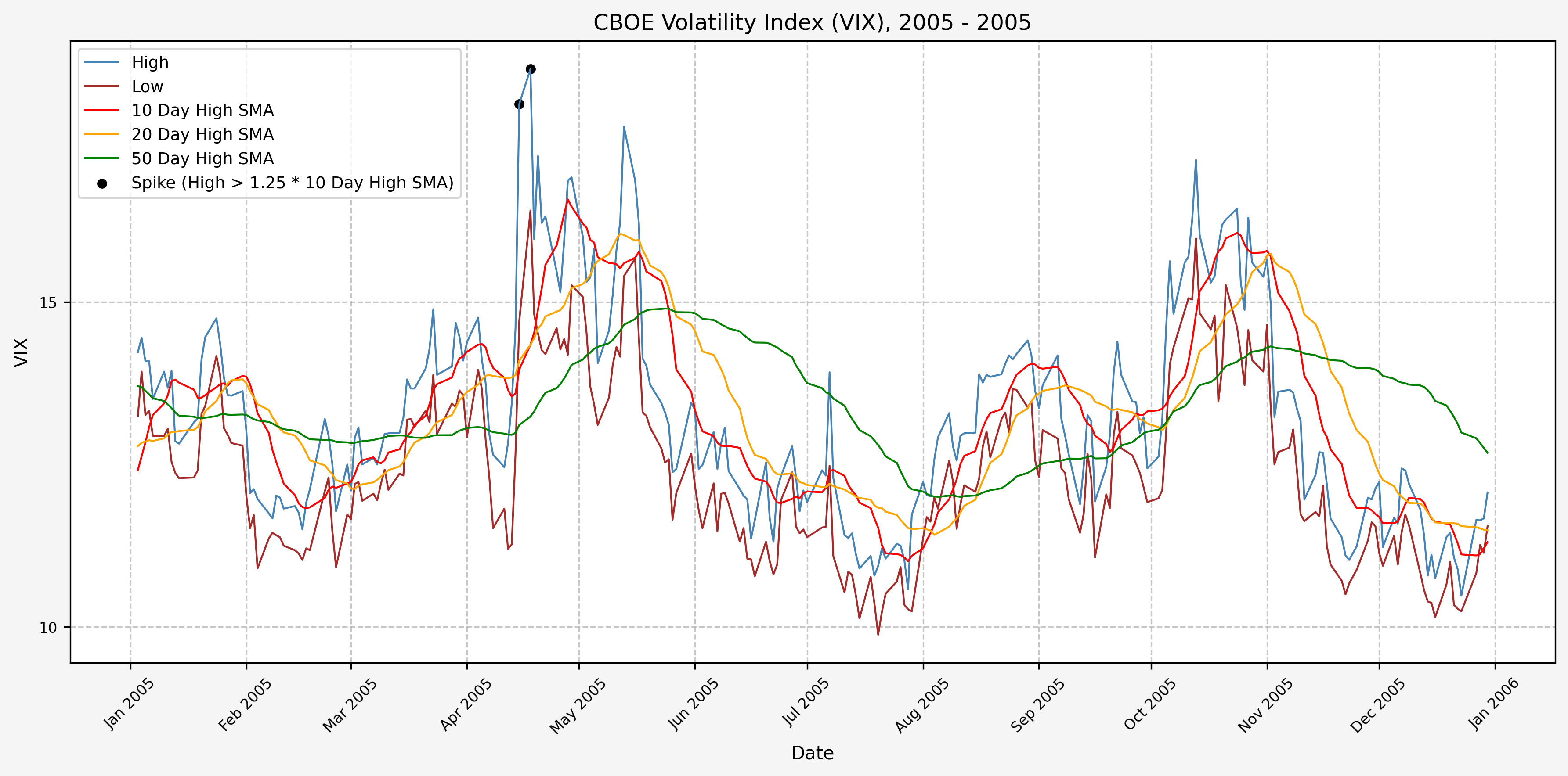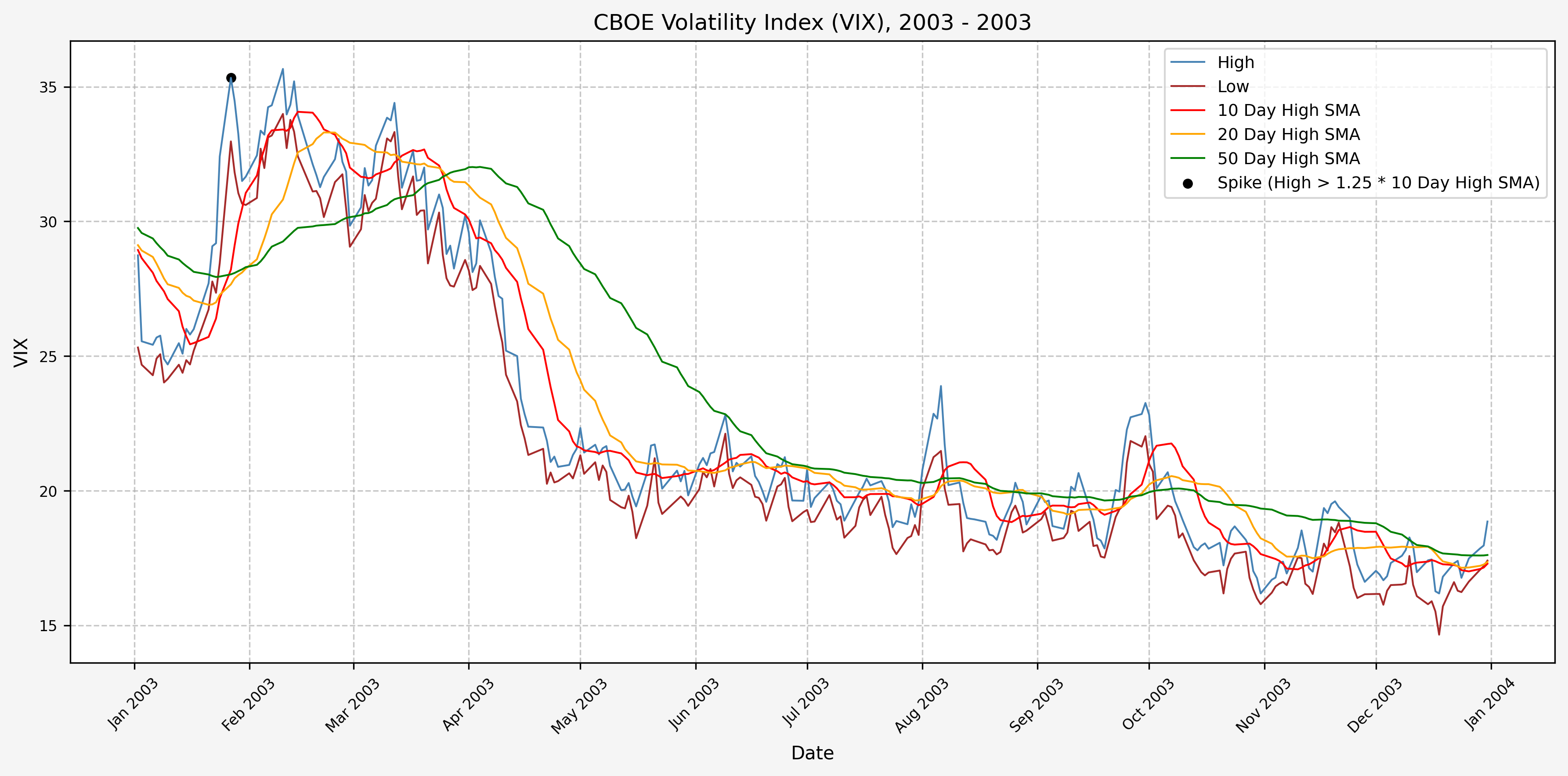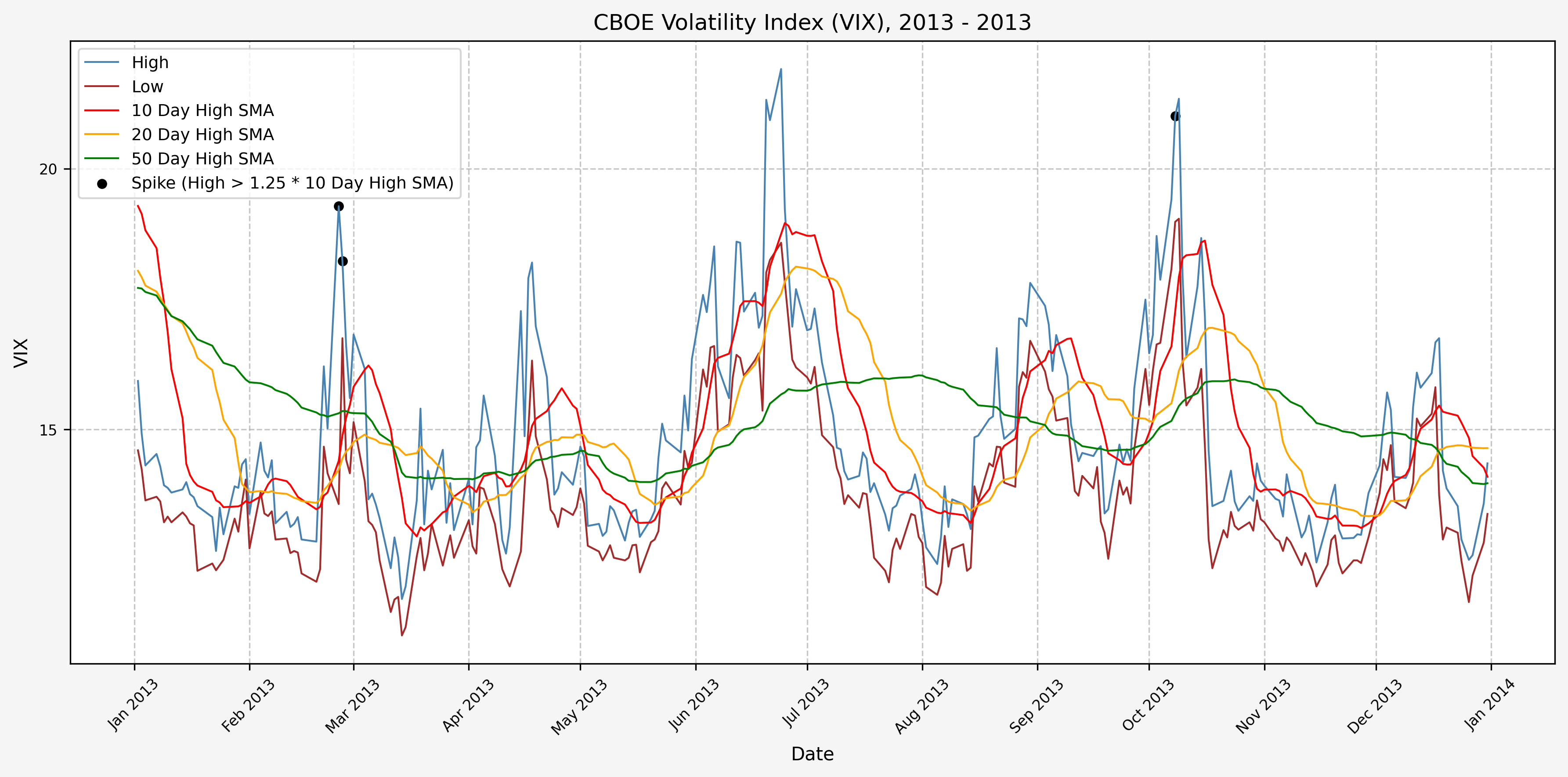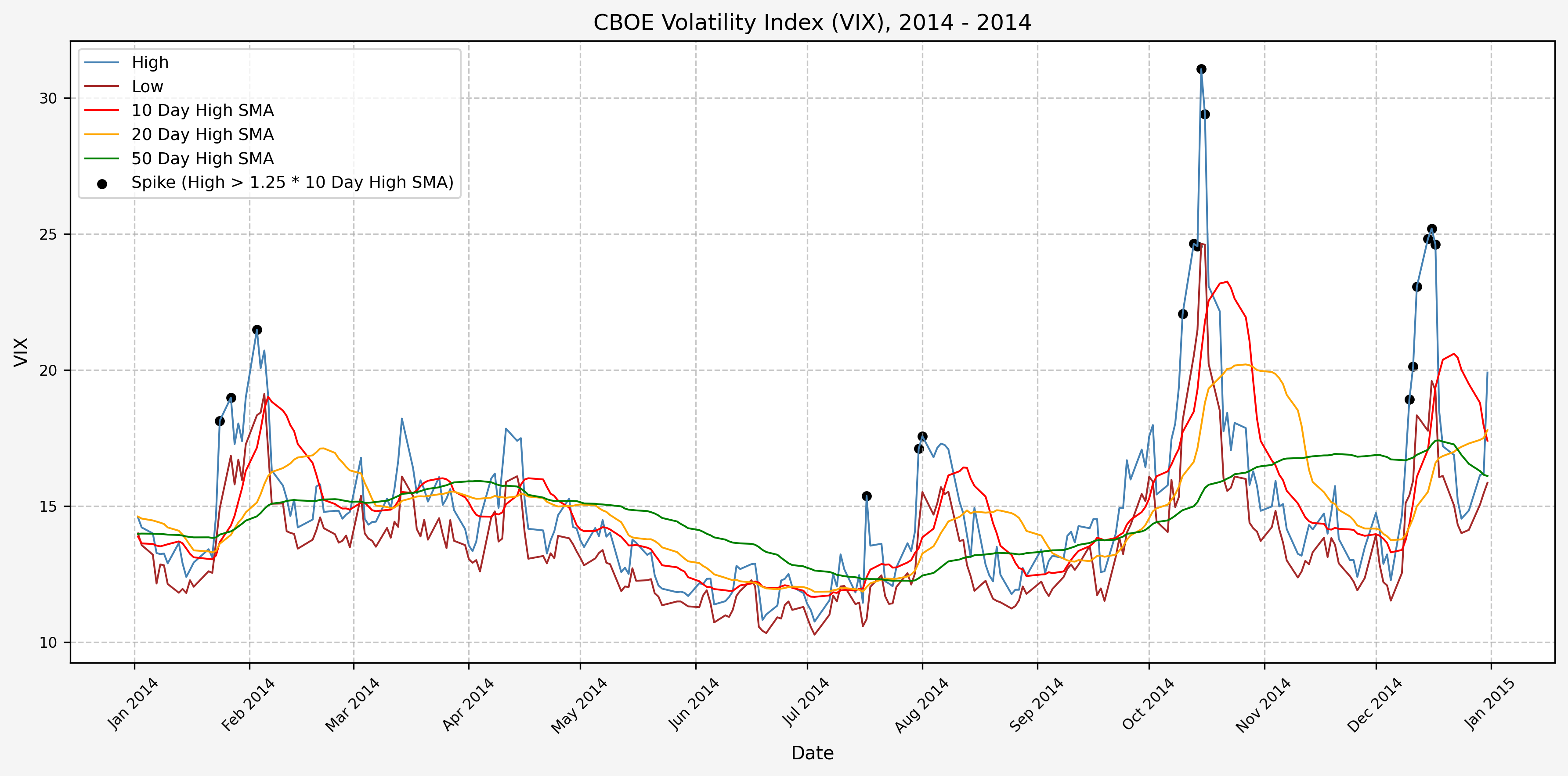 We will start the 10 day simple moving average (SMA) of the daily high level to get an idea of what is happening recently with the VIX. We’ll then pick an arbitrary spike level (25% above the 10 day SMA), and our signal is generated if the VIX hits a level that is above the spike threshold.