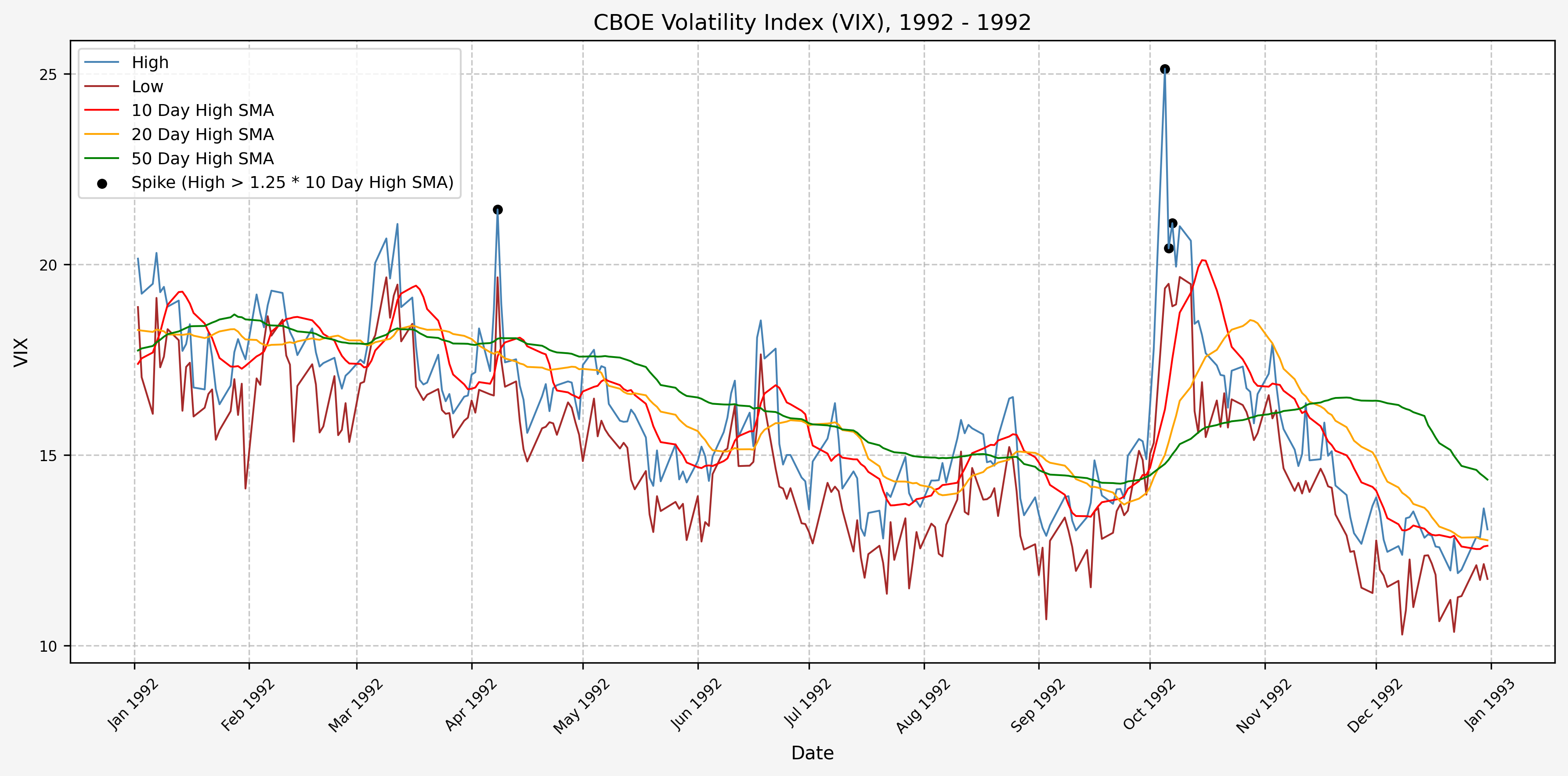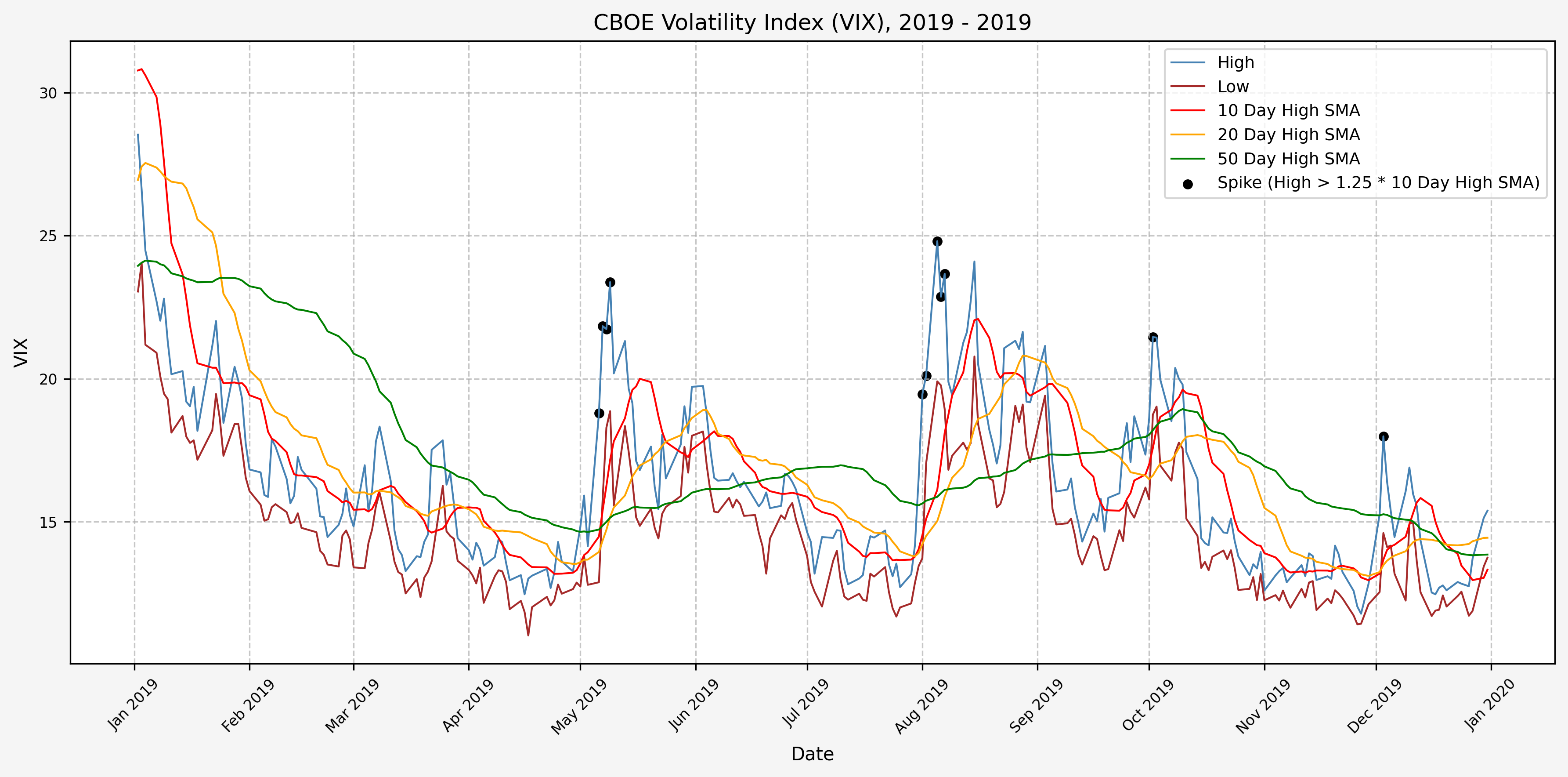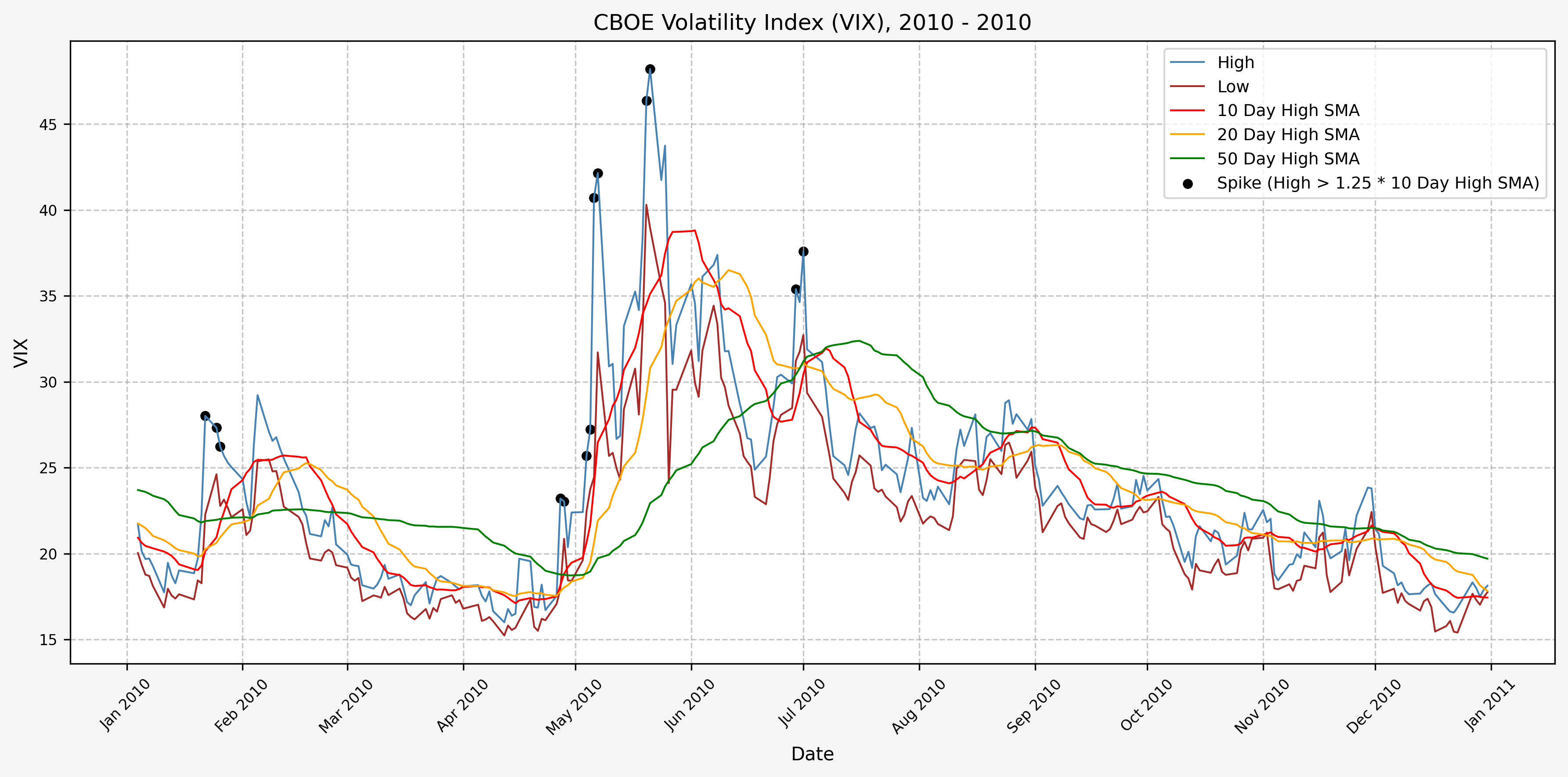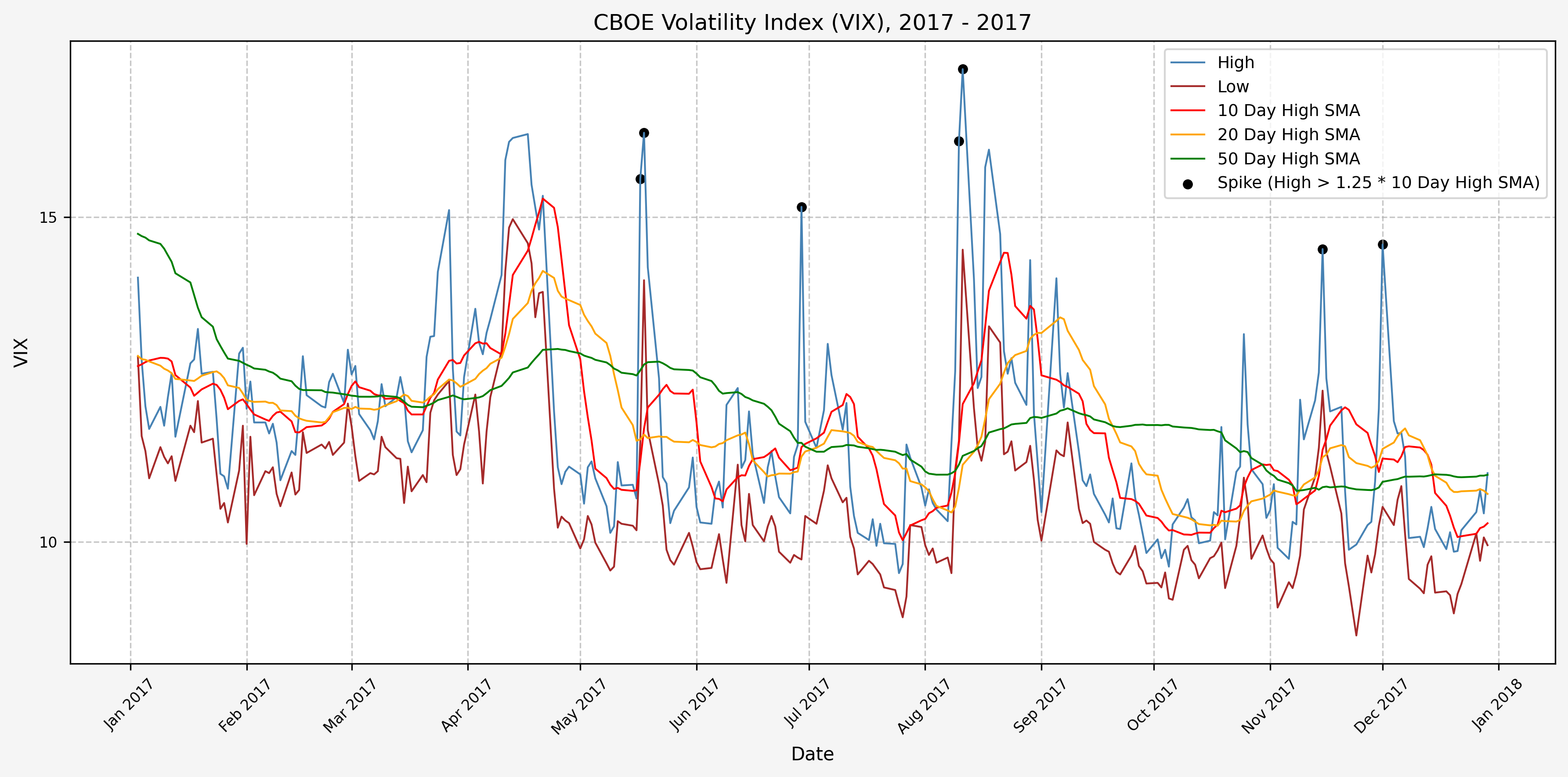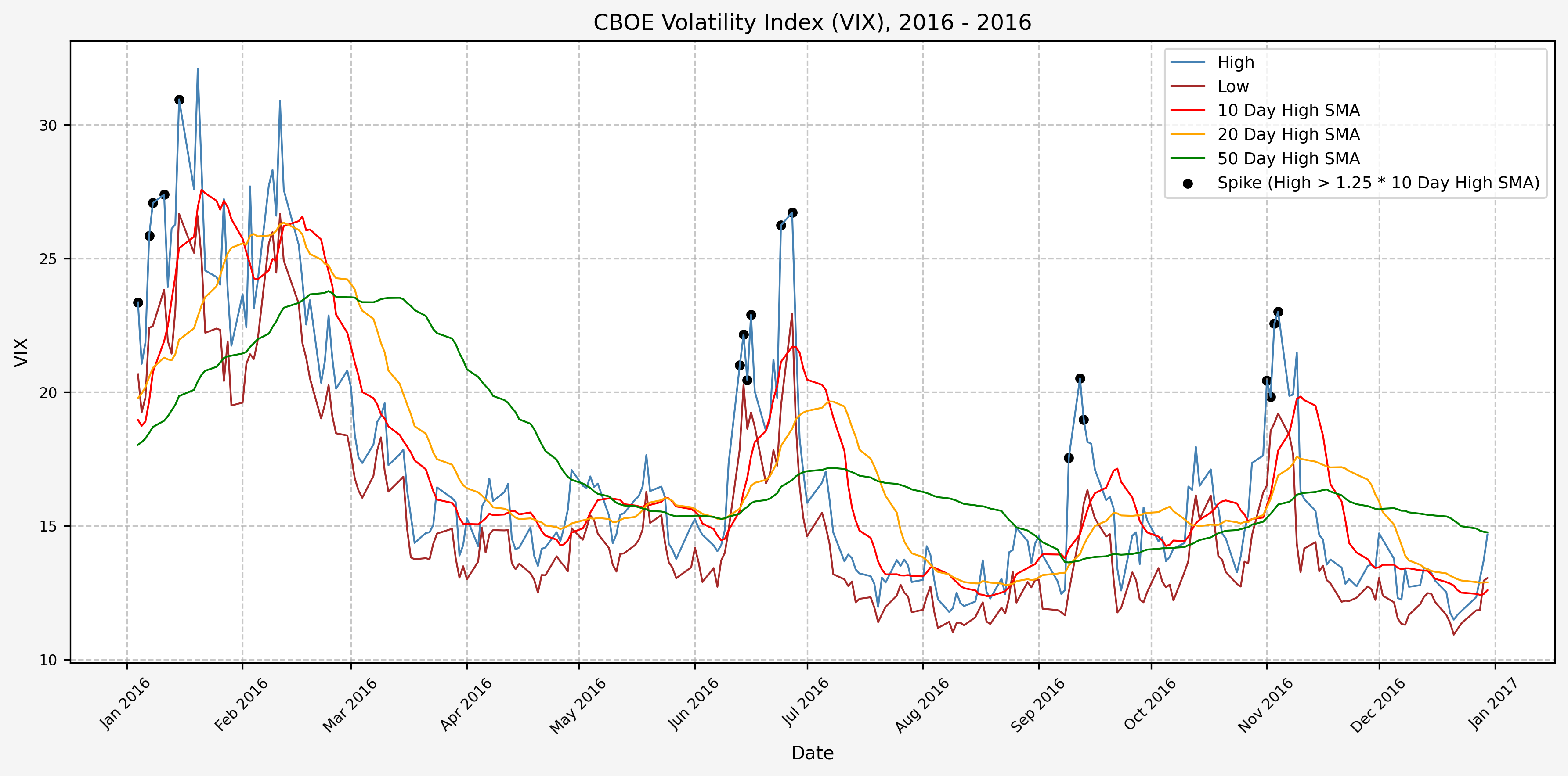 We will start the 10 day simple moving average (SMA) of the daily high level to get an idea of what is happening recently with the VIX. We’ll then pick an arbitrary spike level (25% above the 10 day SMA), and our signal is generated if the VIX hits a level that is above the spike threshold.