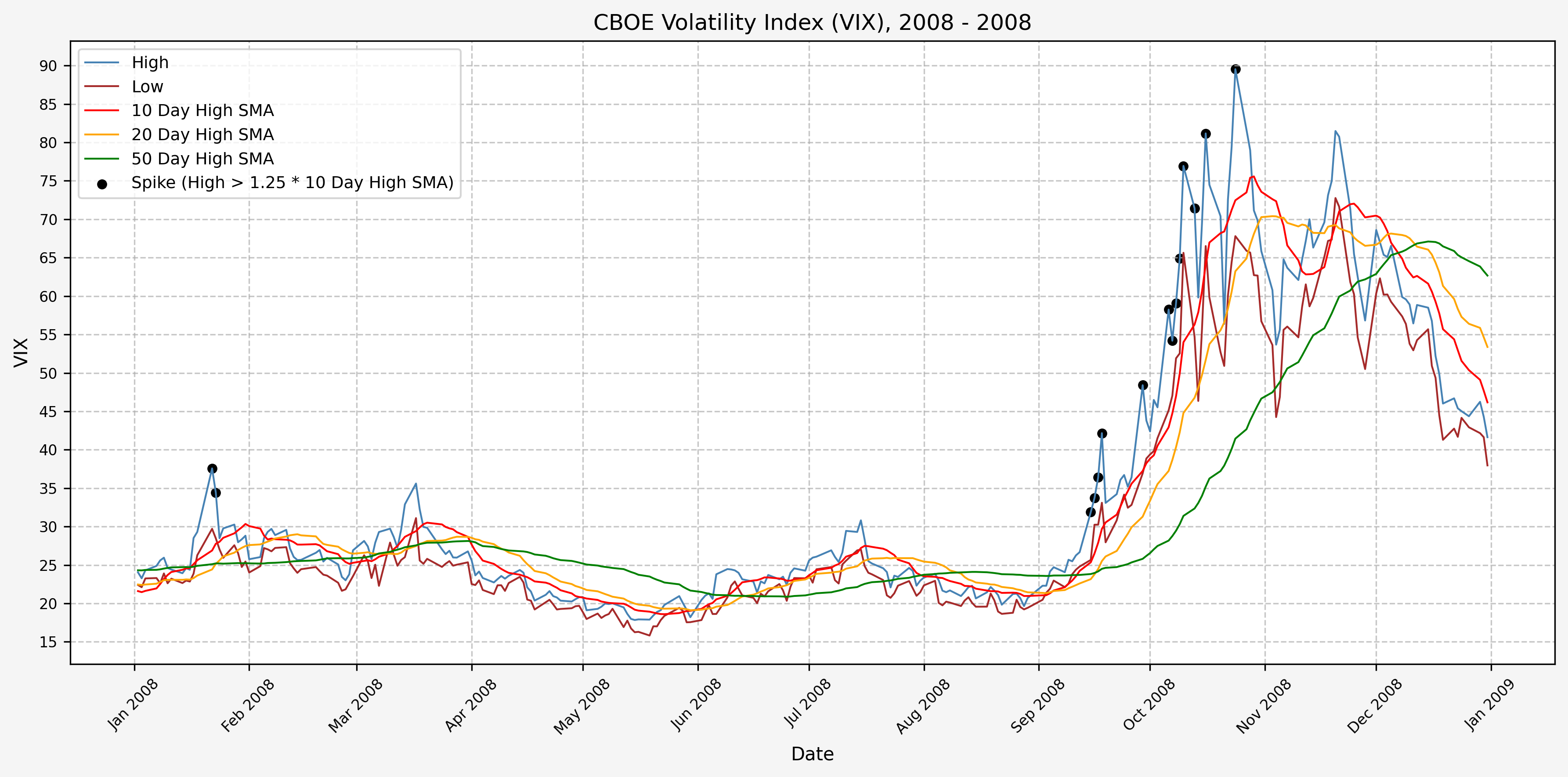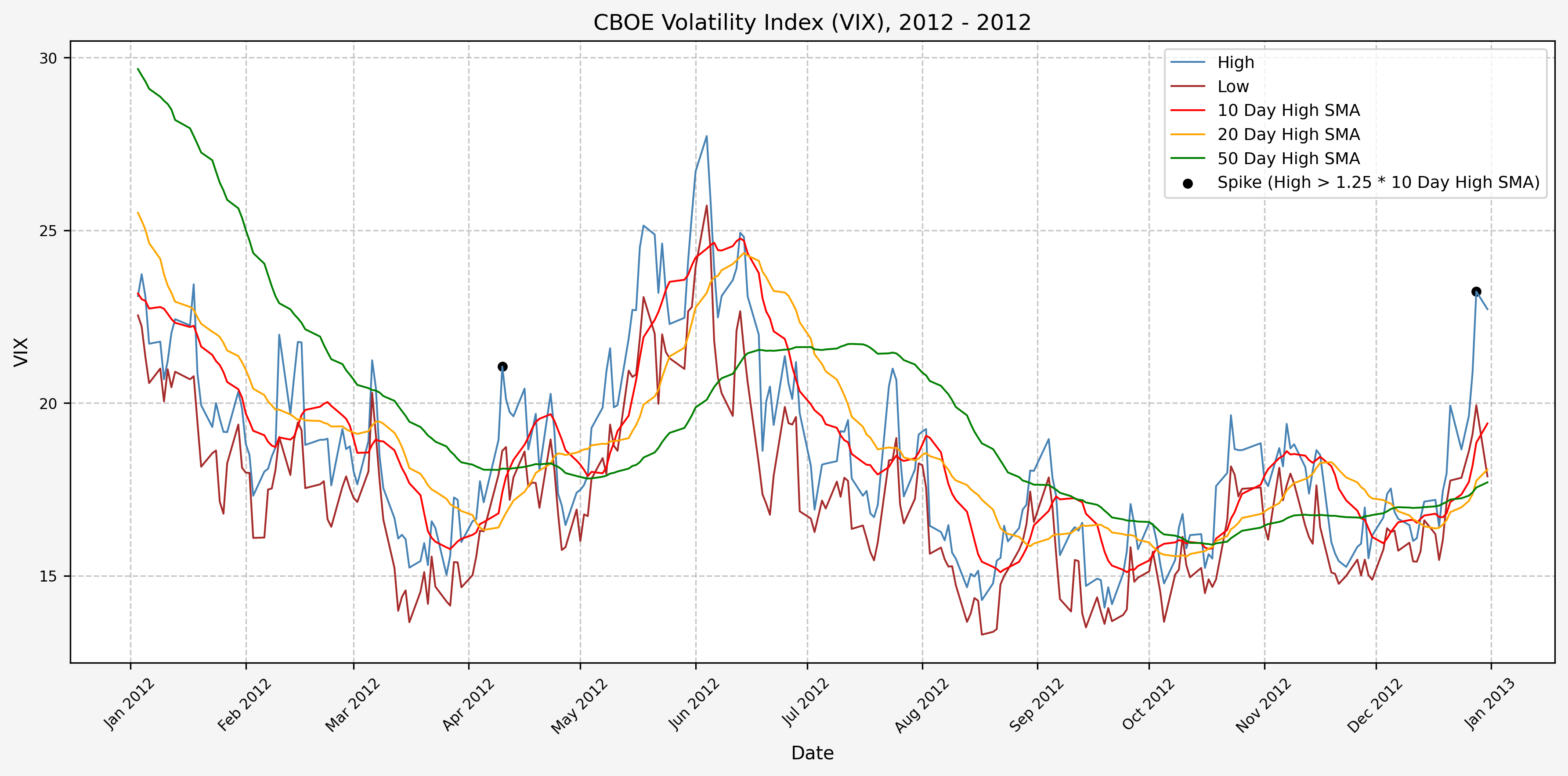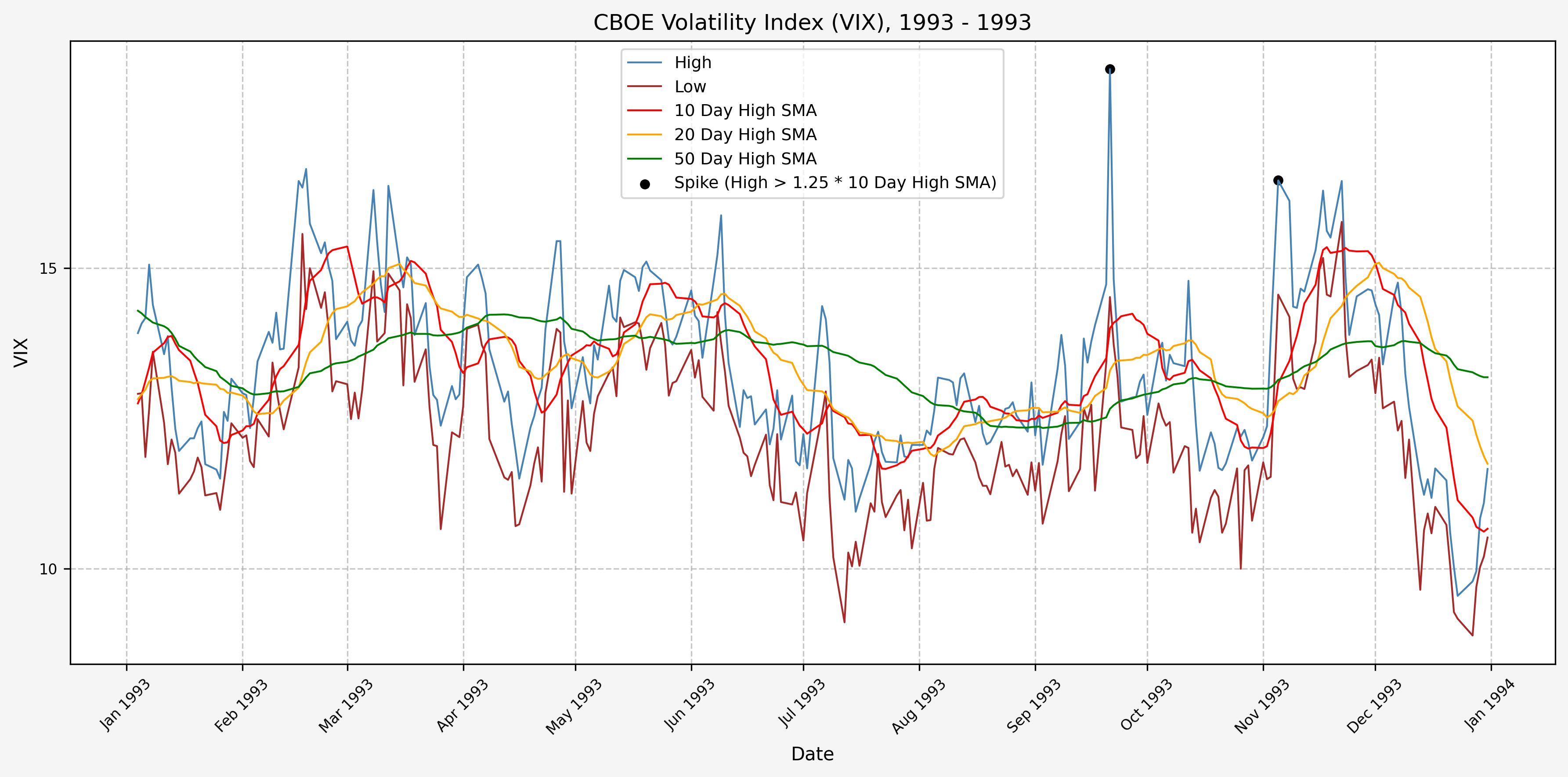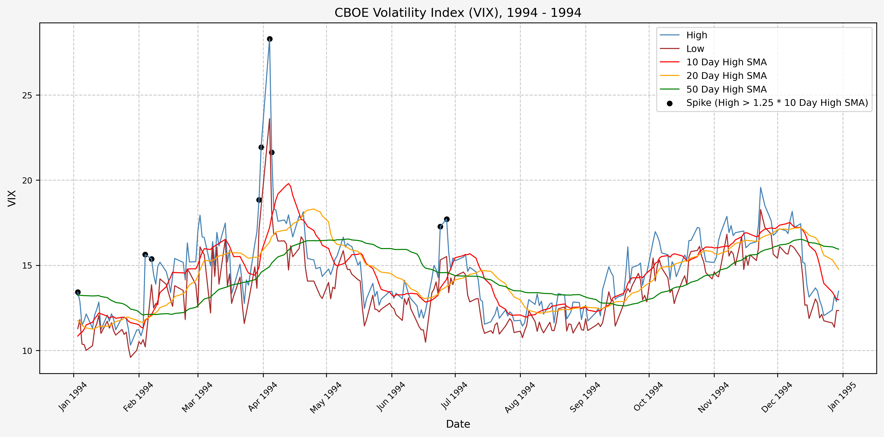 We will start the 10 day simple moving average (SMA) of the daily high level to get an idea of what is happening recently with the VIX. We’ll then pick an arbitrary spike level (25% above the 10 day SMA), and our signal is generated if the VIX hits a level that is above the spike threshold.