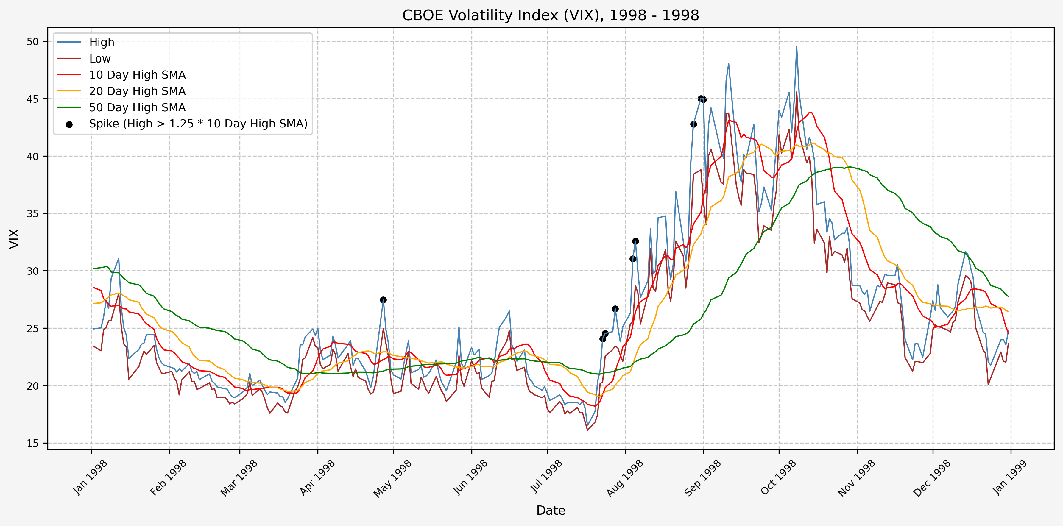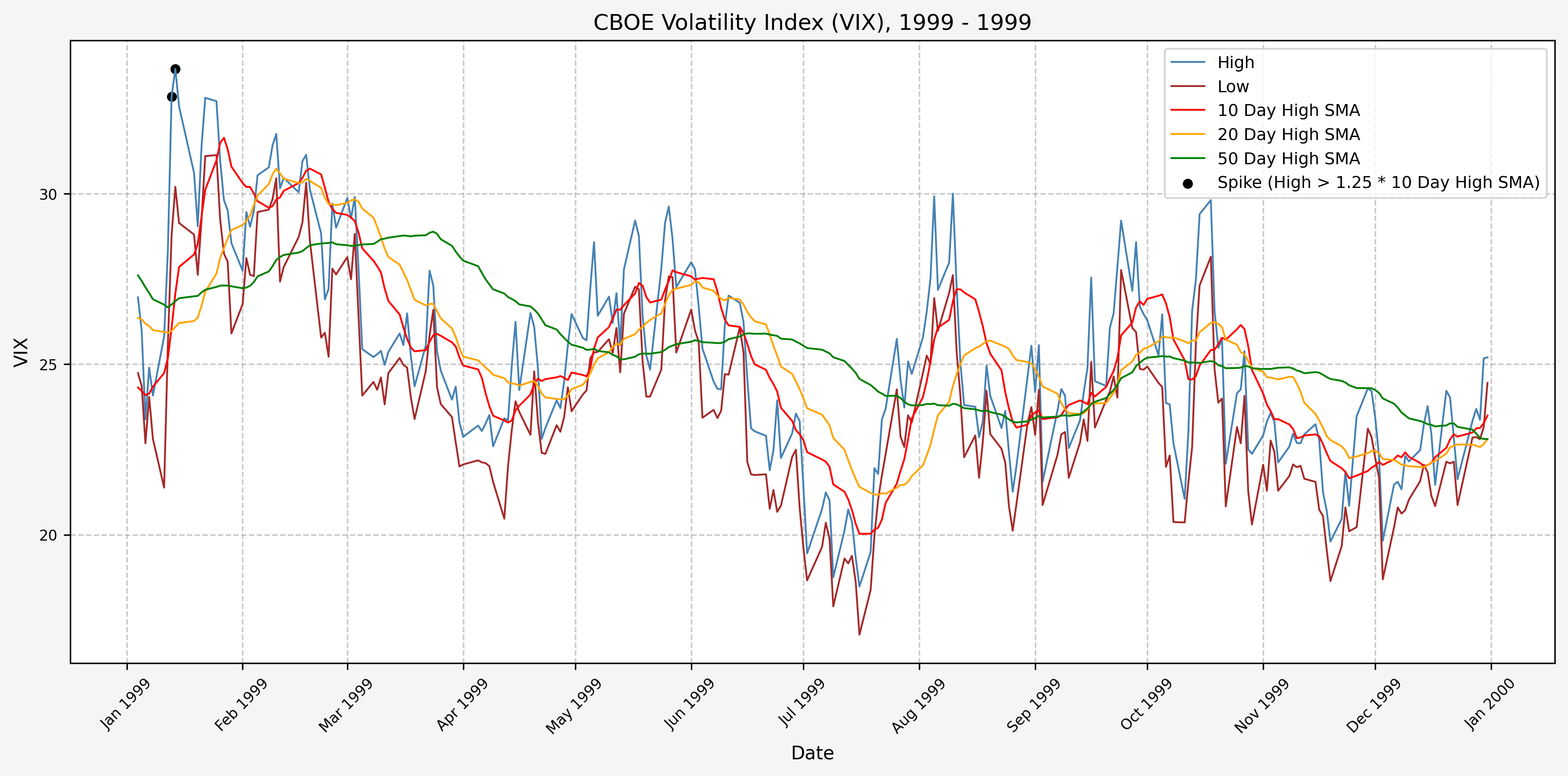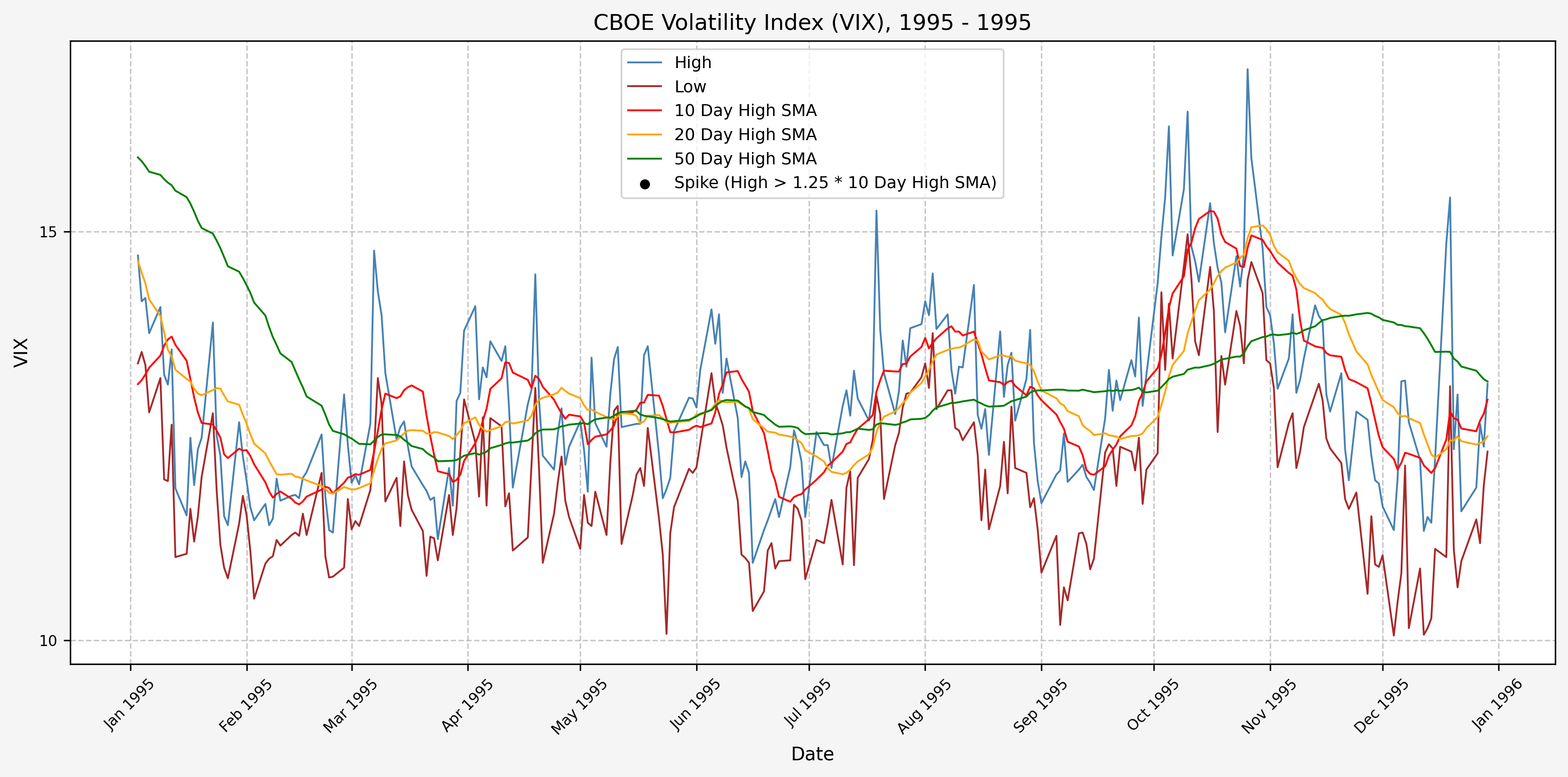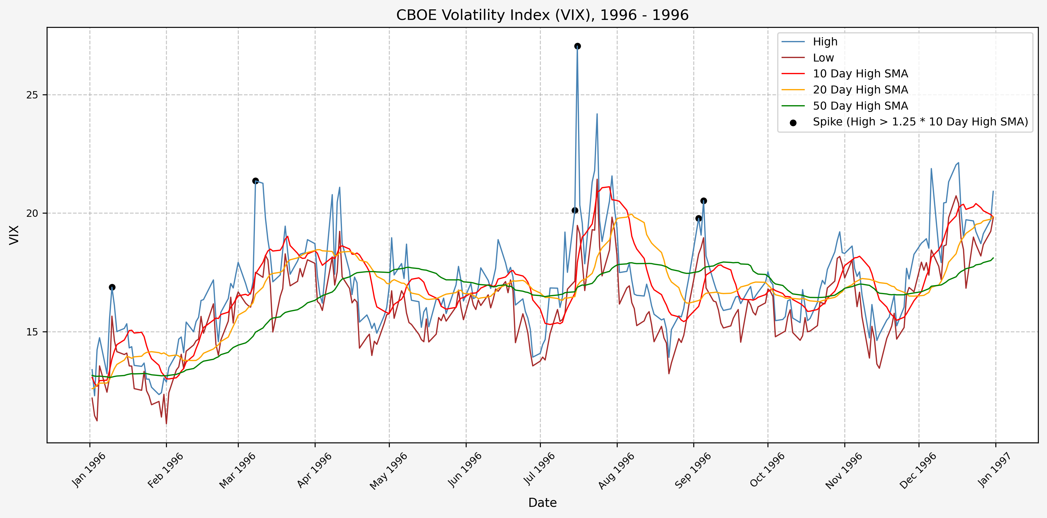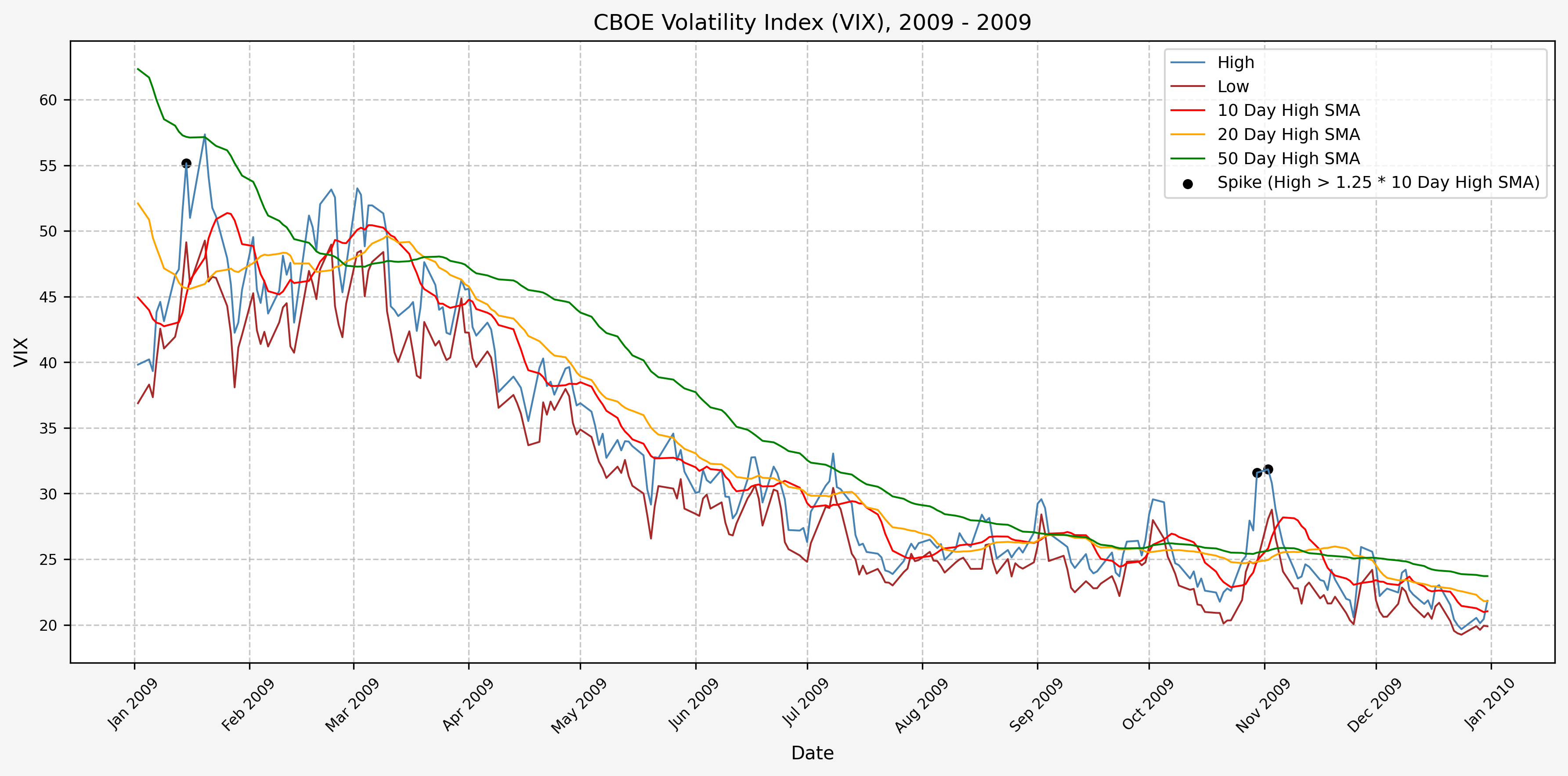 We will start the 10 day simple moving average (SMA) of the daily high level to get an idea of what is happening recently with the VIX. We’ll then pick an arbitrary spike level (25% above the 10 day SMA), and our signal is generated if the VIX hits a level that is above the spike threshold.