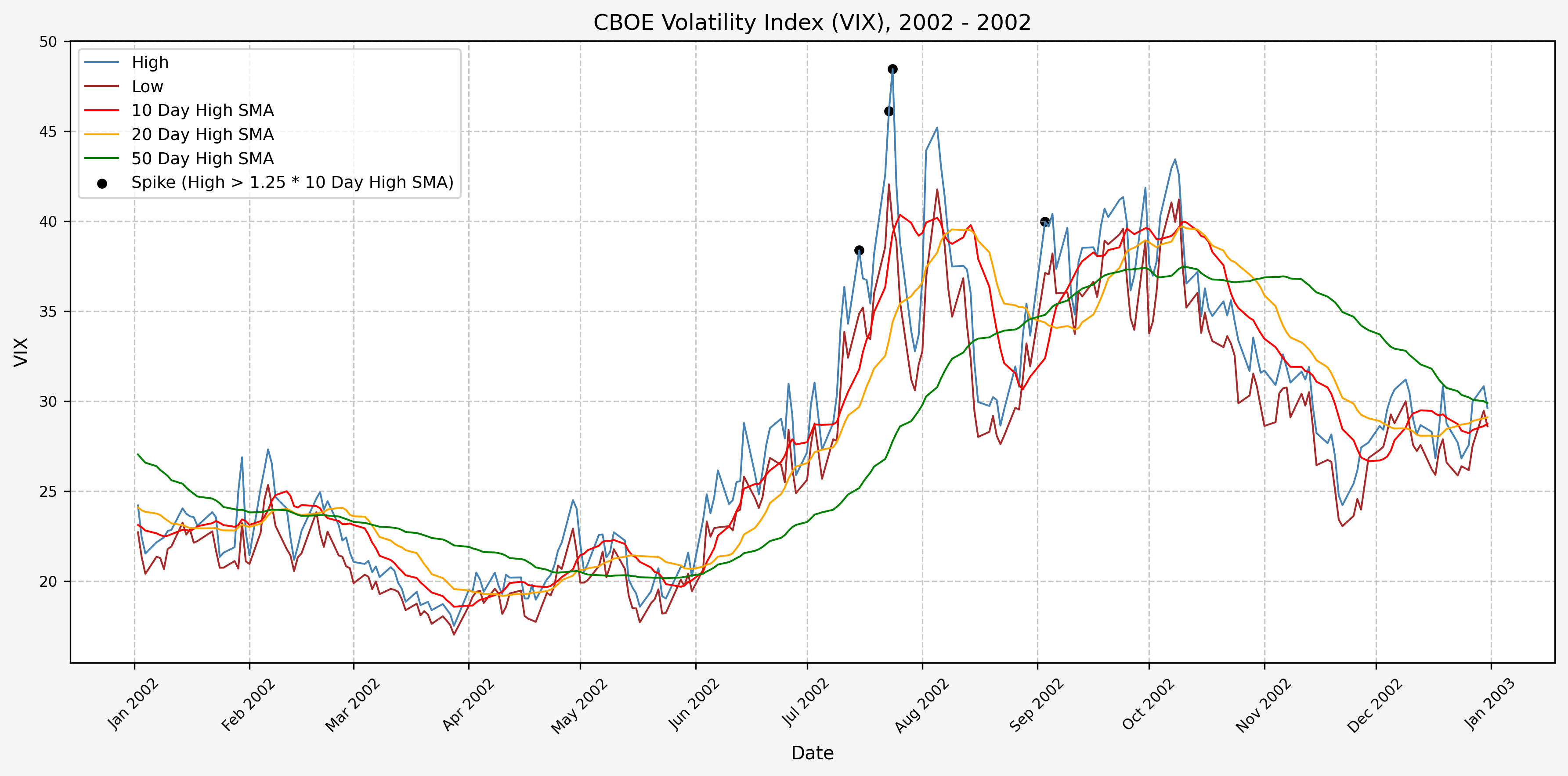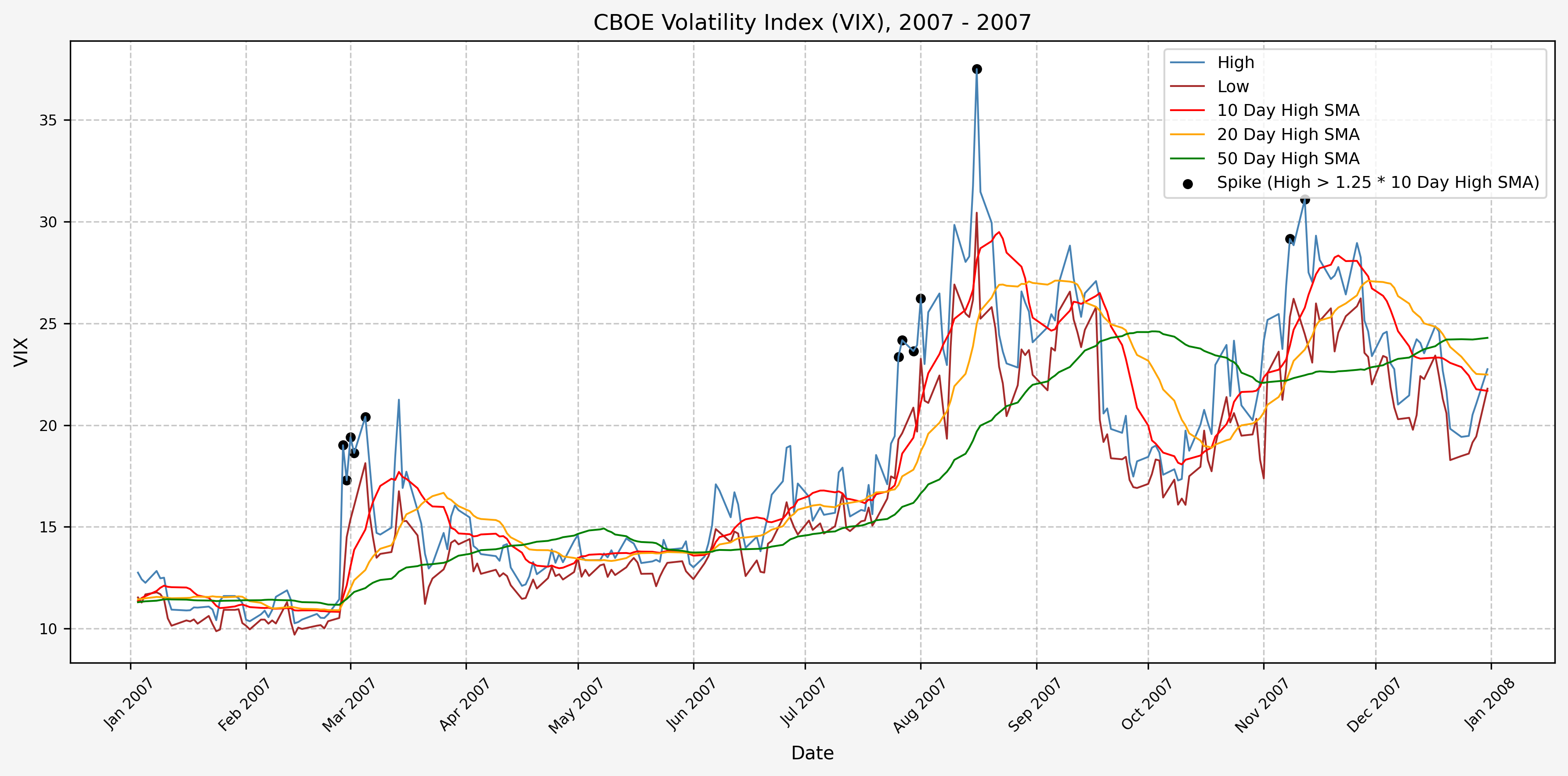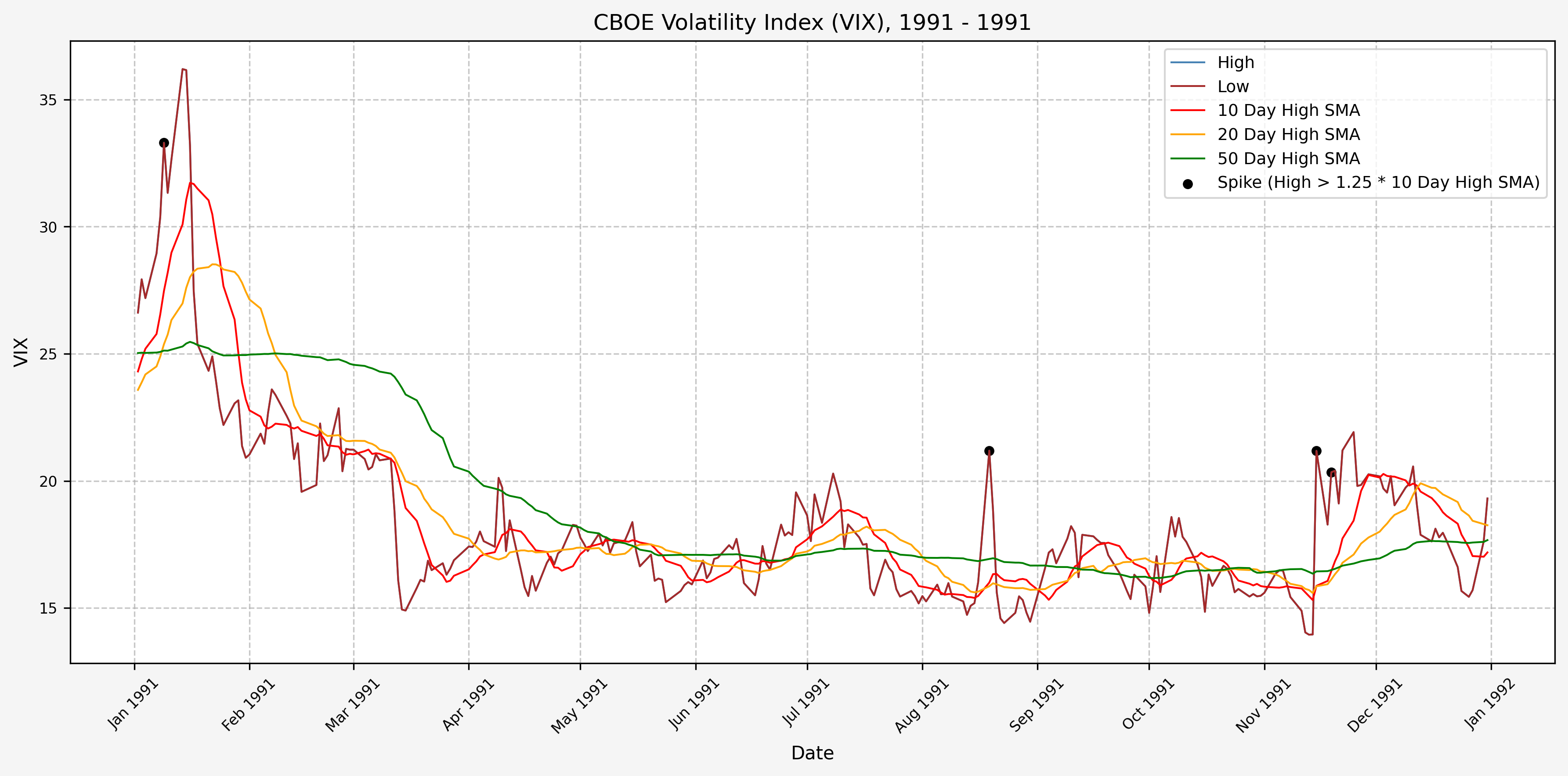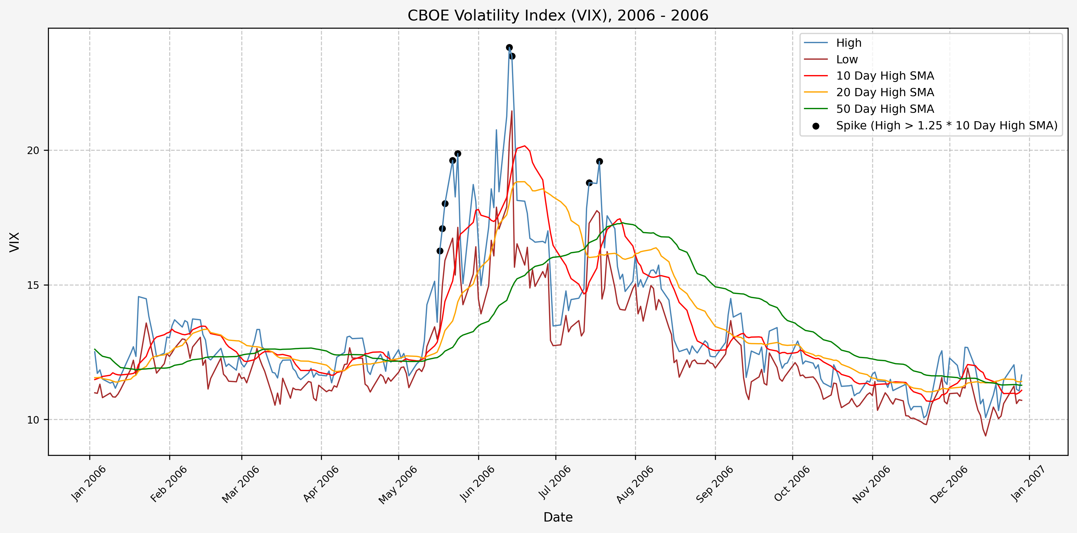 We will start the 10 day simple moving average (SMA) of the daily high level to get an idea of what is happening recently with the VIX. We’ll then pick an arbitrary spike level (25% above the 10 day SMA), and our signal is generated if the VIX hits a level that is above the spike threshold.